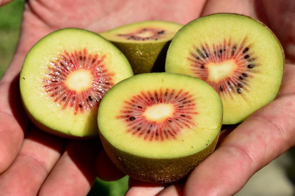 レッドキウイは比較的小ぶりで産毛がほとんどなく、果肉は中心部が赤く、周りが黄緑色。